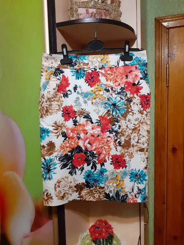 Стильная юбка в цветочный принт на подкладке с карманами длина-56 пот-37 поб-44