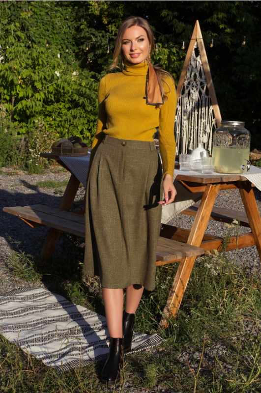 Юбка миди трапециевидного силуэта c защипами по талии зеленый графит хаки коричневый