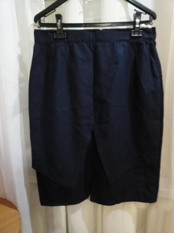 колір темно синій, дуже гарний фасон, вузька й поверх ще одна, размер38, 44, 46, шерсть, полиэстерн, заміри:талія 40,стегна 56,низ ширина 54, довжина 64