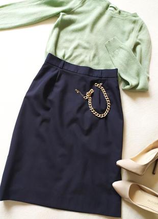 Юбка карандаш темно-синего цвета. Шикарная костюмная ткань. Состав 60% шерсть, 38% полиэстер, 2% эластан. На подкладке 50% вискоза, 50% полиэстер. Размер XS или S. ПОТ 33, ПОБ 45-47. Длина 58. Состояние идеальное.