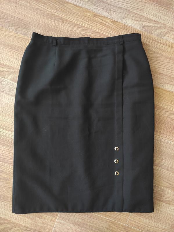 Прямая, стильная юбка от бренда Lineav Сзади шлица Спереди декоративная планка с пуговицами На линии талии по бокам резиночки Цвет насыщенный черный Размер 40-42 Замеры: длина 71 см ПОТ 45 - 46,5 см ПОБ 58 см Состав: полиэстер