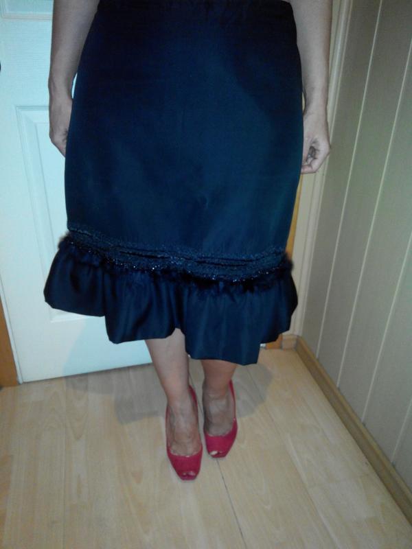 Юбка теплая с воланом. Украшена мехом кролика и тесьмой. Волан не падает (двойной слой ткани). Замеры: От 38 см (есть широкая резинка, тянется до 42-46 см), Об до 54 см, длина 57 см.