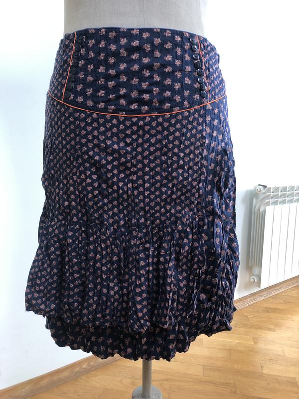 Юбка темно синя в квіточку. Виробництво Індія. Дуже цікава модель. По верху частково іде рюша. Юбка з‘єднана з підкладкою швом по низу. Довжина 56 см. Пот 42-44