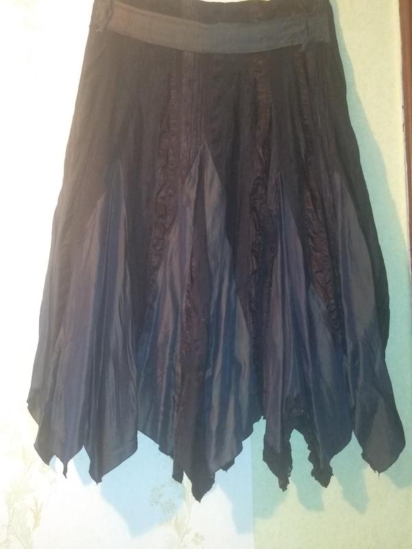 Интересная юбка с различными вставками: темная бронза (плотный шелк), темный шоколад (тонкий вельвет). По бёдрам должна быть плотно, к низу расширяется за счёт вставок. ПОТ 40см, длина 77/87см.