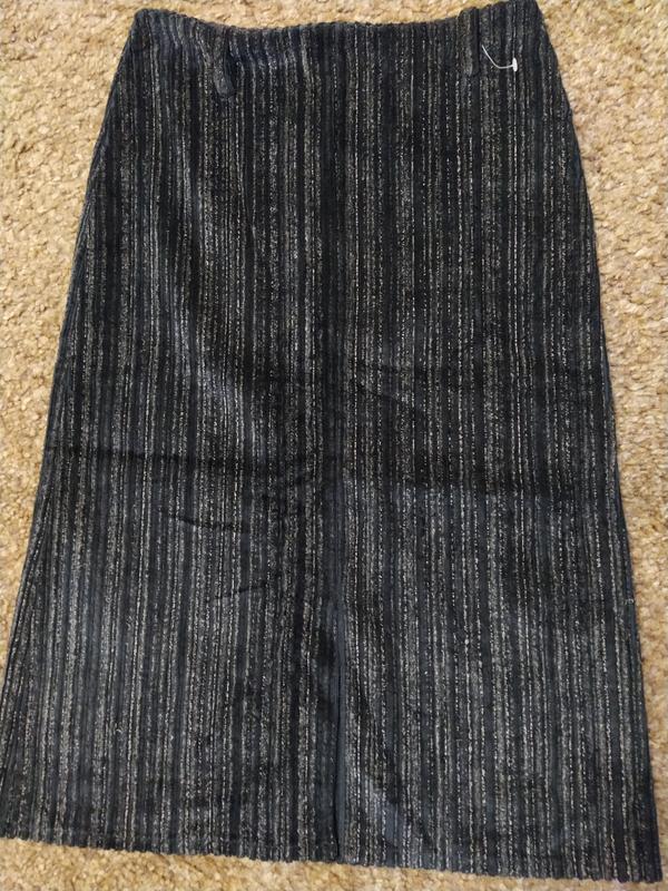 нижче колін,рівна,з розрізом попереду.матеріал м'який і добре тягнеться. сидить відмінно.