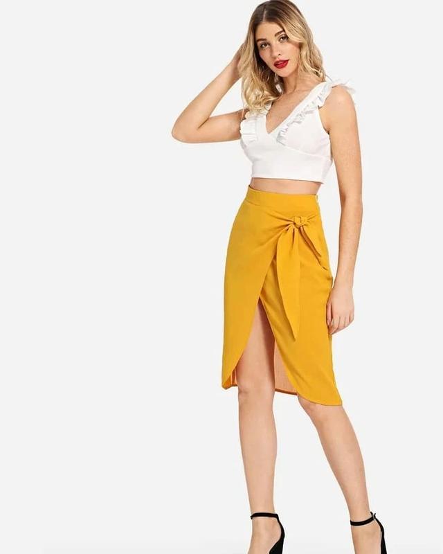 ❤️яркая юбка с имитацией запаха, не светится, цвет на этикетке охра, не тянется Фото на модели похожей юбки!! ☑️ Размер- 18 Пояс 103, поб 60, длина 59/76 ☑️ Бренд- f&f ☑️ Состояние- новая с биркой Фото на теле не делаю!!!
