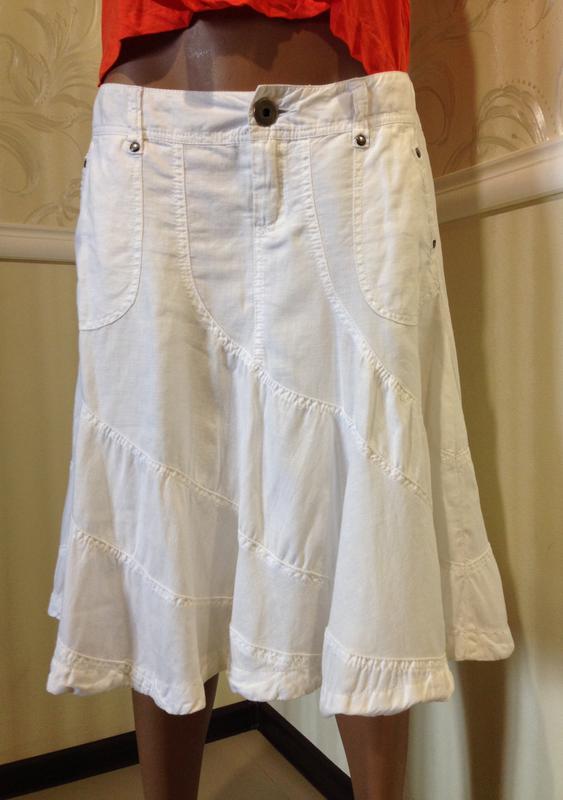 Спідниця DENIM білосніжного кольору, расклешенного крою, попереду два накладних кишені, ззаду два накладних кишені, повністю на підкладці, на гудзику і заклепках нанесений логотип бренду. Бренд EDS BY ESPRIT. Склад: 100% бавовна, підкладка - 100% тонкий бавовна. Розмір 40/L. Стан ідеальний, нової речі. Дуже красива, комфортна модель. Заміри: ПОТ - 43 див., ПОБІДИ - 55 див, довжина - 57 див. Ласкаво просимо в мій магазин. Відомі бренди, відмінна якість - доступні ціни.