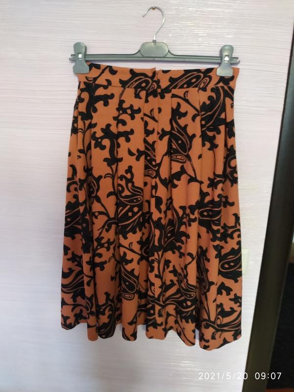 Красивая юбочка.Насыщенный цвет пудры с черным рисунком.По бокам врезные карманы.Ткань не растягивается,за счёт чего юбка прекрасно держит форму.Не мнётся.Пот-35,длина-70.Реальный цвет на последнем фото.