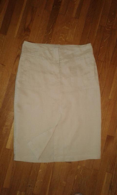 Очень качественный 100% лен -тонкая, светло песочная ткань, впереди два накладных с прорезями кармана, молния посредине, вертикальный тройной шов и шлица. ПОТ 38см, ПОБ 48см, Длина 65см.