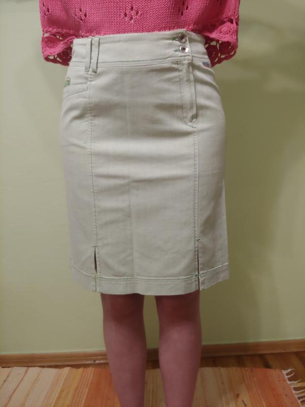 Класична джинсова спідничка ніжно - салатового кольору з розрізами. Тканина плотний якісний коттон, трохи тягнеться. Розмір 10/М, по запиту зроблю виміри