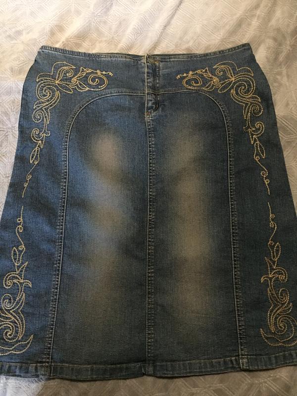 Джинсовая юбка DenimCo. Размер указан 14, европейский 42. Котон 85%,полиэстер 14%,эластан 1%. Длина 65, пот 46,5, поб 53. Юбка декорирована оригинальной вышивкой.