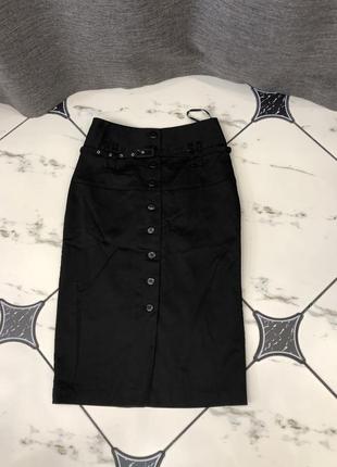 чорна спідниця-олівець з високою талією, всі ґудзики робітники. Розмір 34-36. Склад тканини 97% бавовна, 3% elastane. Заміри вироби: напівобхват пояса 32-33 см, довжина виробу 66 см, напівобхват стегон 42 див. Підійде на розмір XS-невелику S