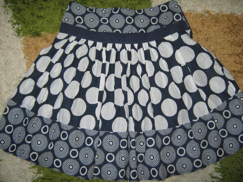 розширена к низу с интересным рисунком с переходом есть подкладка материал тоненький. Длина 59 см в поясе 39 см сбоку молния. Темно синий цвет