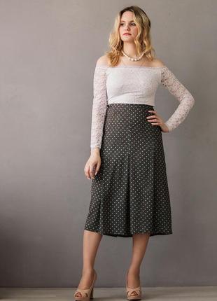 Юбка в складку, на вискозной подкладе. Длина по боку 72 см. По бокам резиночки. Ткань: шёлк, не мнётся (после стирки можно не утюжить). Цвет: хаки в ментоловый горошек. Размеры: 48, 50, 52, 54.
