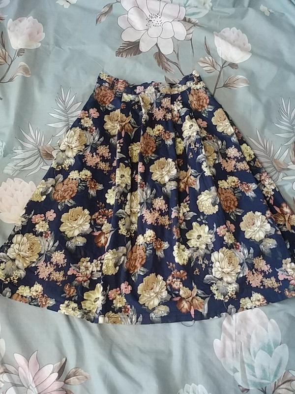 Классная юбка, ткань не тонкая, хорошо держит форму. От талии складки, есть шлевки для ремешка. Ткань хлопок с эластаном, бирочки со составом нет. Сзади на молнии. Состояние новой вещи! Длина 64, ПИТ 30
