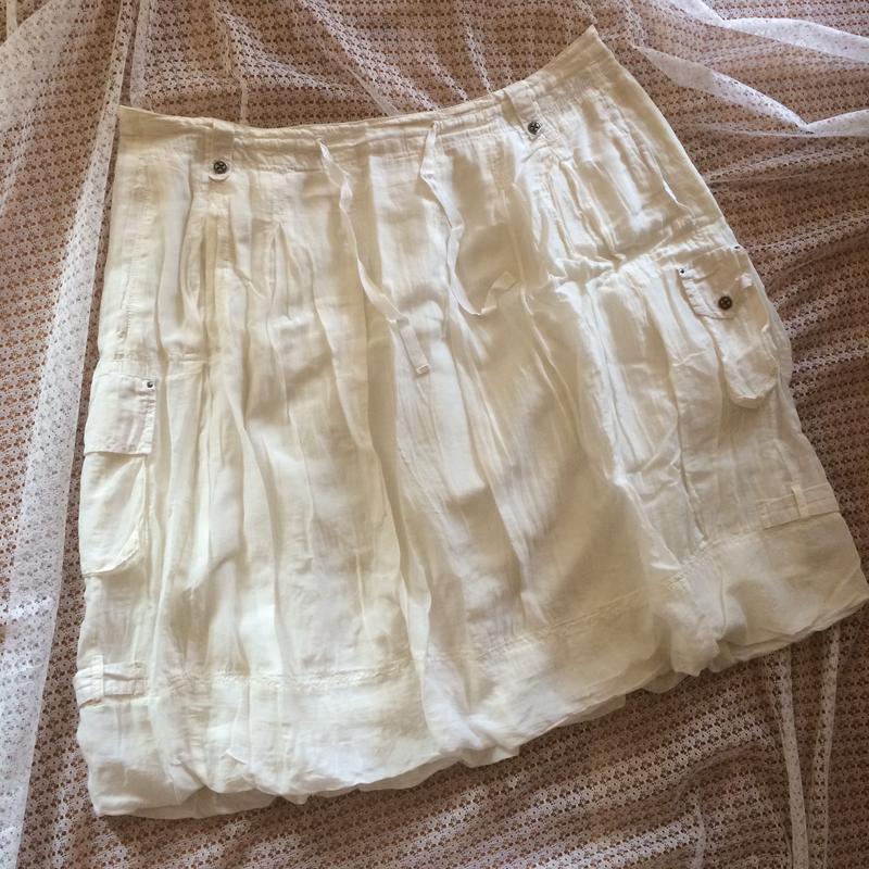 Легкая шелковая юбка в стиле бохо Next Очень крутая стильная юбка! Верх - практически невесомый хлопок с шёлком, подклад - тонкий хлопок Очень комфортна на жару Верх к подкладу пришит с подворотом, по бокам карманы Эффектный сложный крой Сбоку молния. Цвет молочный Размер 18 евро 46 Состояние очень хорошее, из нюансов - небольшое пятнышко на петле для пояса ( последнее фото), немного мелких катышек ( в основном по бокам) и небольшое пожелтение. В целом всё не критично, в цене учтено Длина 60см, ПОТ 48см, ПОБ 69см