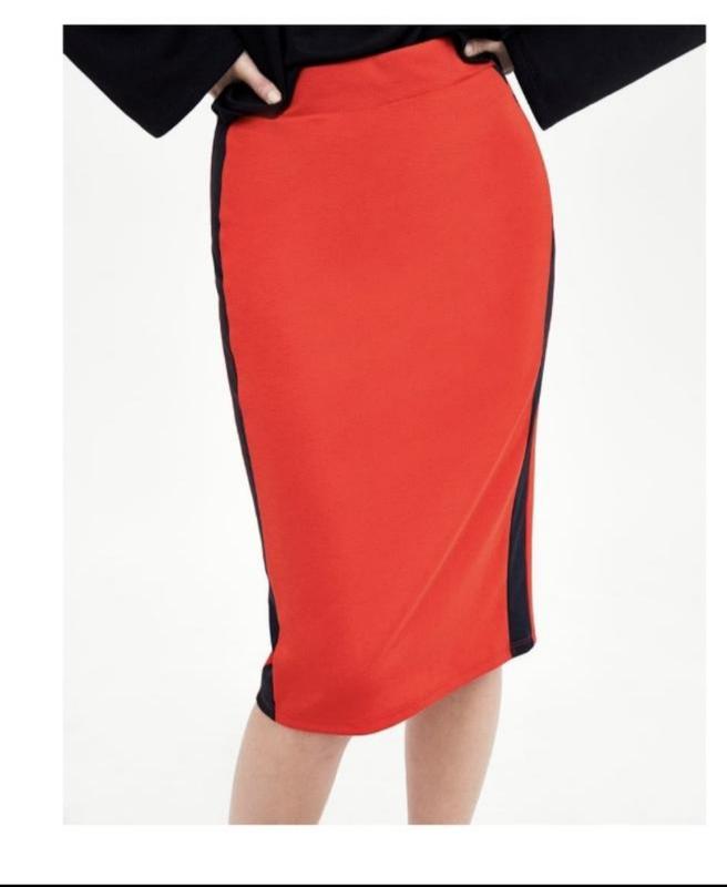 Спідниця Zara трикотажна, з боків вставки чорного кольору. Заміри: ширина в талії(резинка) 34см, ширина в стегнах 42см, довжина 67см.
