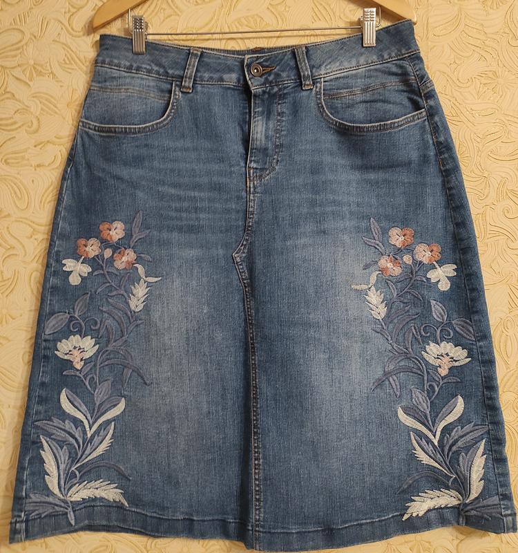 Джинсовая юбка с вышивкой 50-54 р-ру.Застегивается на пуговицу и молнию.Сбоку действующие карманы.Модель слегка расширена книзу.Котон мягкий. Состав: 80% коттон, 18% полиэстер; 2% эластан. Замеры: талия 43/48 см; бедра 57 см.; длина изделия 64 см.. Отправляем после 100% оплаты на карточку.Пересылаете по Новой или Укр.почто.За более детальной информацией умоните.