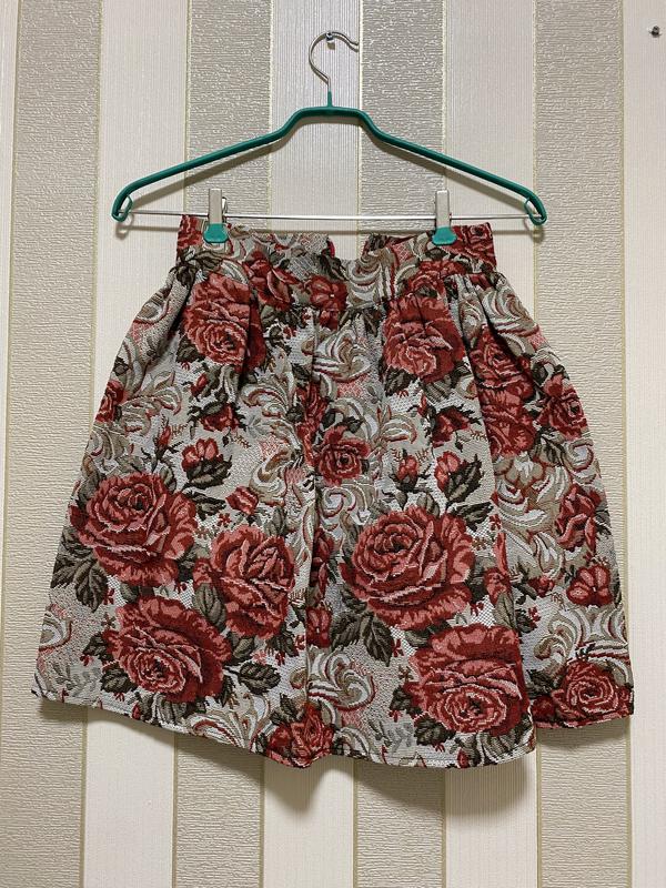 Об‘ємна спідниця з гардинної тканини, яка тримає форму. Бірки нема, тому не можу сказати склад тканини, але це суміш натуральної і синтетичної. Одягнута 2чі