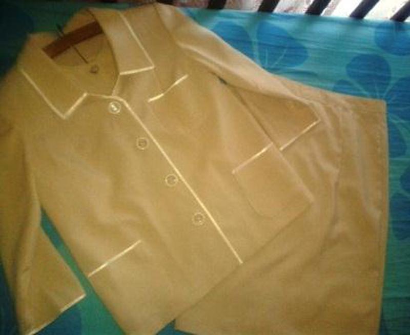 Бежевий костюмчик трійка шили на заказ, ходили разів 3. Підійде на M-L. Костюм складається із піджака (рукав 3/4), бузи і спіднички до коліна.