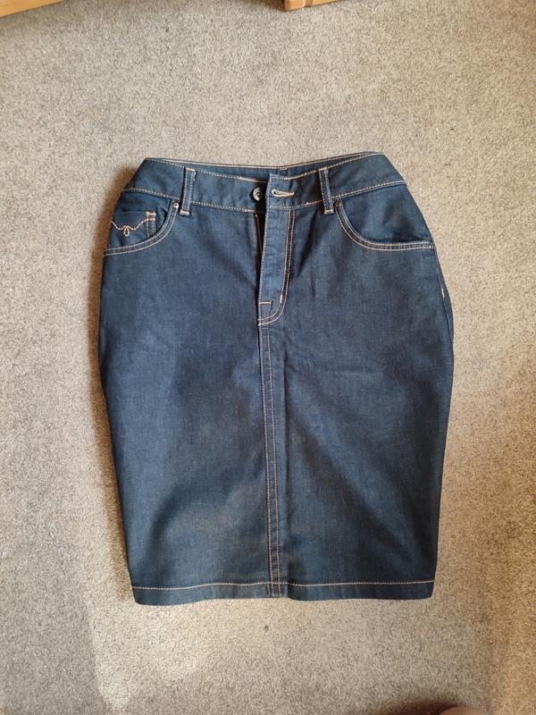 плотный джинс юбка длиной 56 см состояние новой пот 44 до колена сзади 2 кармана