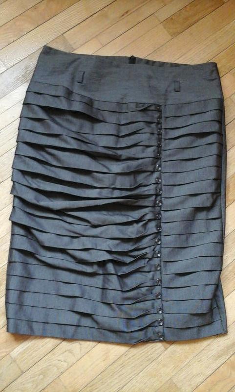 Сіра офиссная спідниця фірми Dela Lucci, розмір - 44, довжина - 65 див., ПОТ - 40 див., ПОБІДИ - 47 див., склад : 85% котон, 12%, віскоза, 3 % еластин.
