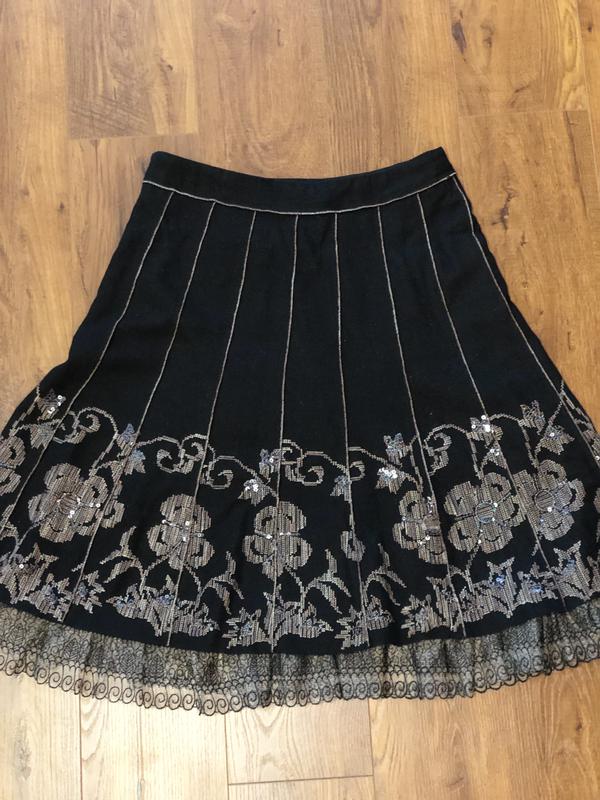 Спідниця в ідеальному стані. Замок працює без нарікань. Тканина на відчуття як шерстяна. Пояс 40 Довжина вся 64, довжина верхнього шару 59.