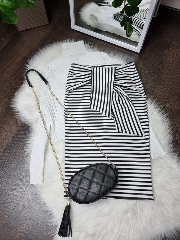 Трикотажная юбка в полоску по фигуре спереди с бантом, сзади маленькая роспорка . В идеальном состоянии, без дефектов. Размер указан М , также подойдет на S.