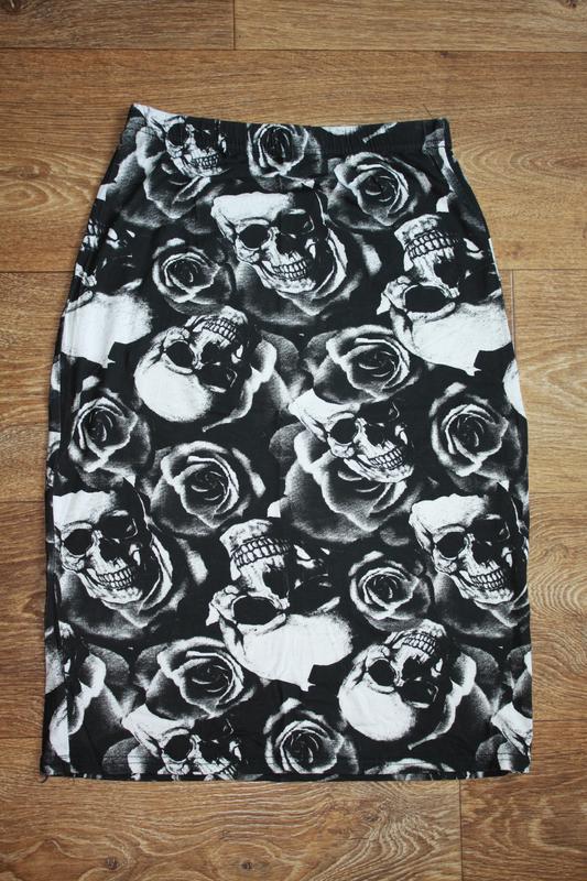 Трикотажная миди юбка в черепа. Состояние идеальное, размер С-М, хорошо тянетс, пояс на резинке. Надета на ОБ 95, ОТ 70см