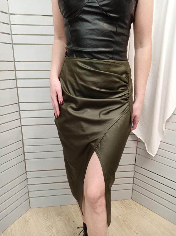 Юбка Boohoo с разрезом впереди. Ткань хорошо тянеться. Размер UK 16, идёт на L- XL, см.замеры: Пояс - 40 ПОБ - 51 Длина - 67 Состав: полиэстер/ эластан