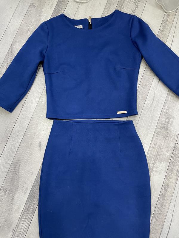 Костюм синього кольору,розмір S,довжина кофтинки 41 см,напівобхват грудей 41 см,довжина спідниці 61 см,напівобхват талії 31 см,матеріал замш,костюм в дуже хорошому стані,гарно лягає по фігурі.