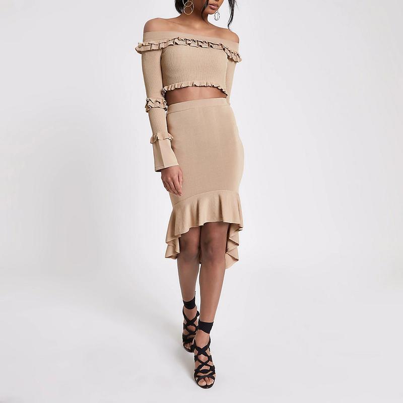 Новая!модная трикотажная юбка-миди с воланом и высокой талией