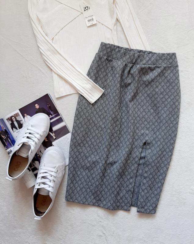 Юбка-олівець бренду szachownica довжини міді,сірого кольору з принтом,з розрізом збоку,тканина тянеться,талія на резинці.Розмір S,M.Ширина поясу 33см,довжина спідниці 62см.