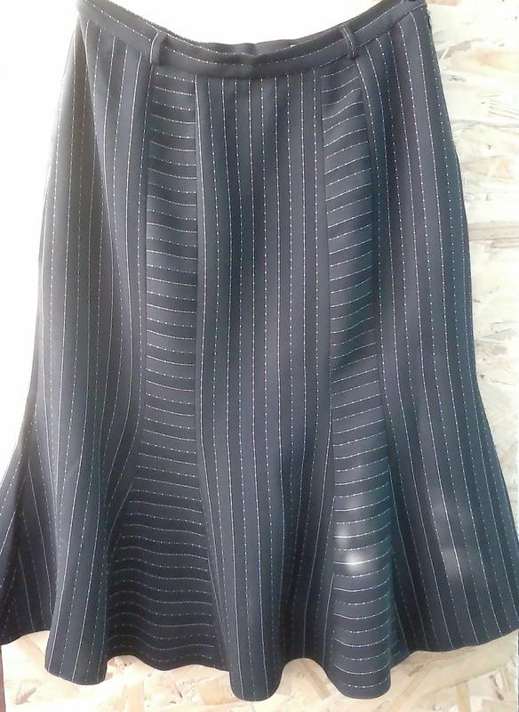 Юбка - годе, выполненная из качественной ткани. Интересный крой, выигрышно обыграна ткань в тоненькую полоску. Юбочка на подкладке, сбоку вшита потайная молния. Длина - 62 см. Сезон - осень, весна и зима (если тепло)