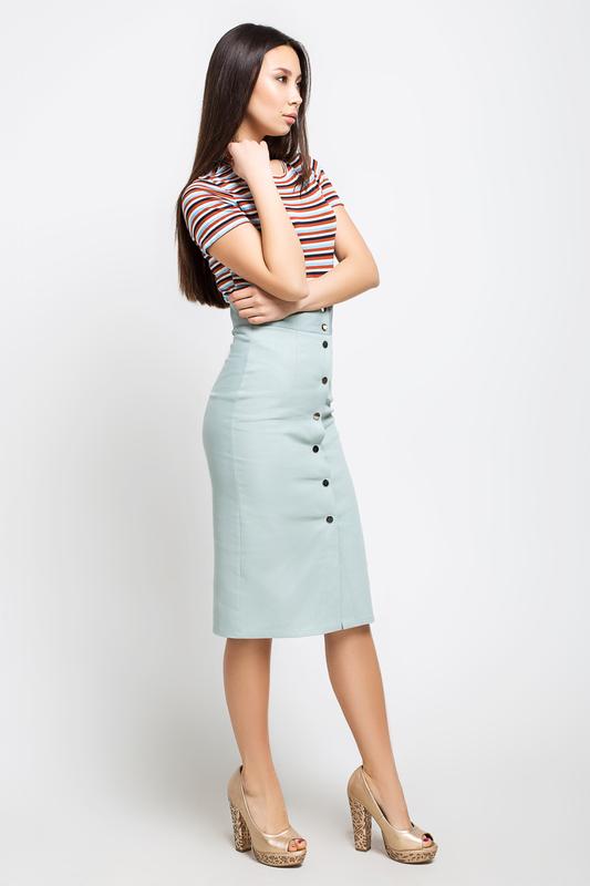 Юбка- карандаш, с стррейч-коттона. На передней и задней половинках выточки от линии талии. Застежка центральная по переду на кнопки, верхний срез юбки обработан притачным поясом.