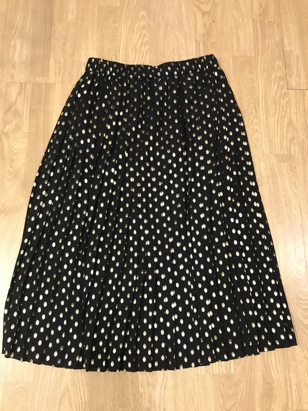 Юбка фирменная отличного качества, плиссировка, ширина по талии 36 см+ резинка, длина 78 см, горох золотой, очень красиво смотрится.