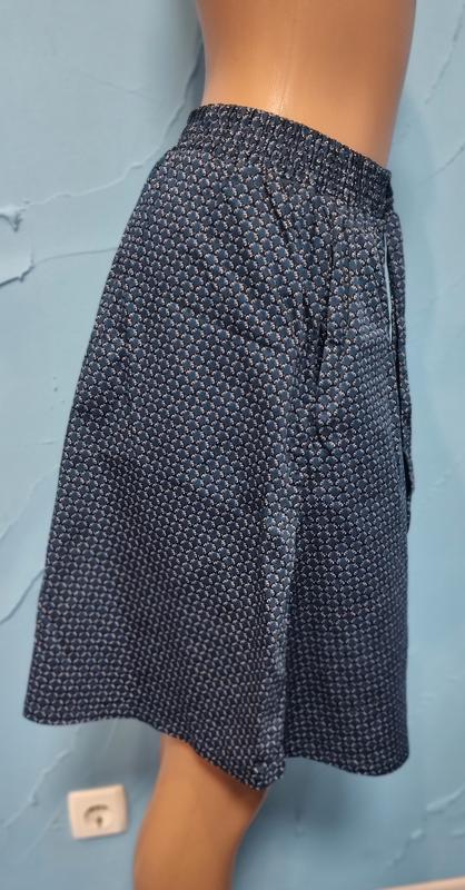 Спідниця легенька та приємна до тіла, довжина міді, фасон кльош. Колір синій з дрібним орнаментом. Має пояс та кармани з боків. Довжина - 54 см, напівобхват поясу - 31 см. Розмір - М-L.