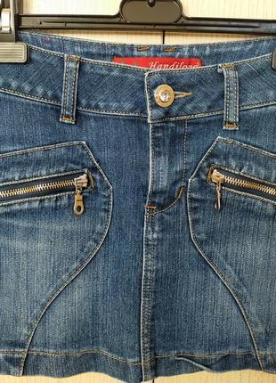 Джинсова спідничка для дівчинки або худенької невисокої жінки. Розмір вказаний 26. Для орієнтиру даю заміри у спокійному (не розтягнутому) вигляді: Пот - 32 см, Пос - 42 см, довжина по боковому шву - 33 см Тканина трохи тягнеться. Спереду за замочками є дві кишеньки. Спідничка у чудовому стані!