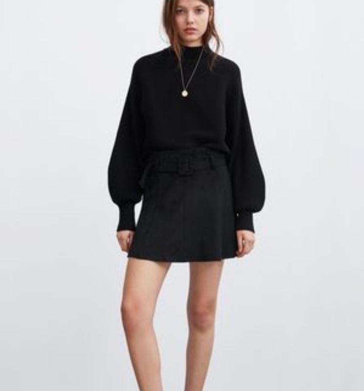 🌿чорна спідниця міні від Zara з поясом, тканина з ефектом замшу Розмір:S Заміри: ширина поясу 34 см, ПО бедер 50 см, довжина 40 см
