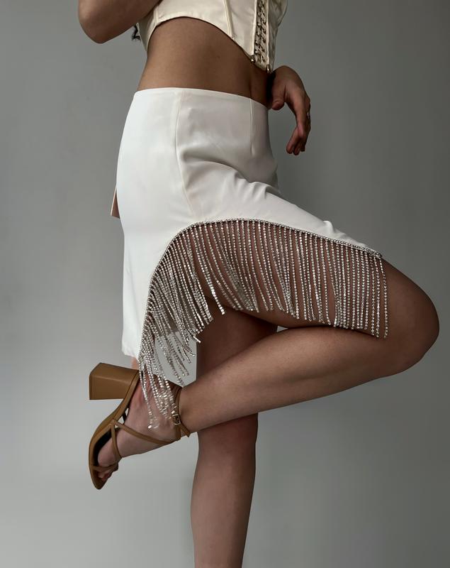 🎀Міні-юбка OhPolly білого кольору, декорована стразами(якісно). Дуже гарно виблискує😍 • 750 грн • Розмір- L • Стан-нова з біркою • Тканина - поліестер 90%, еластан 10%