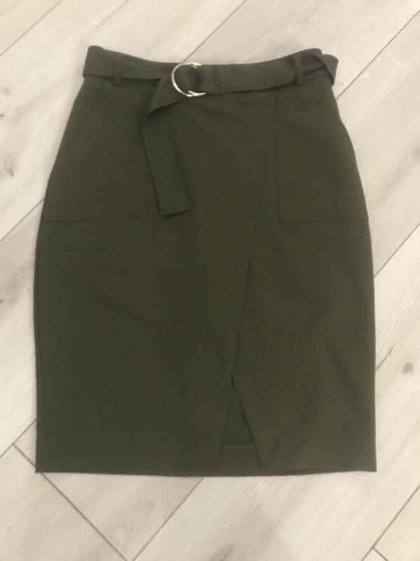 Жіноча спідниця кольору хакі, непідійшов розмір.Є бокові накладні кармани та ремінець з переду розпірка..Висока посадка.Від відомого бренду MOHITO(пояс 32,бедра 44,довжина 54)
