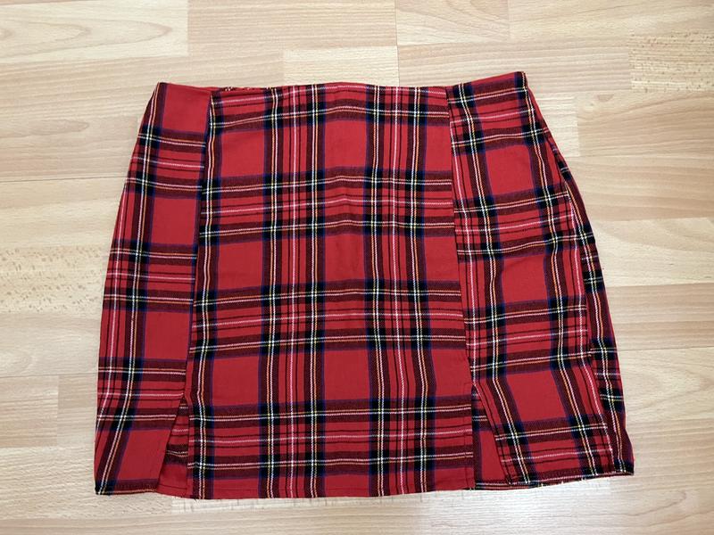 Червона юбка, два розрізи спереду, стан добрий, розмір М, заміри: Довжина 40 Пот 39 Поб 49
