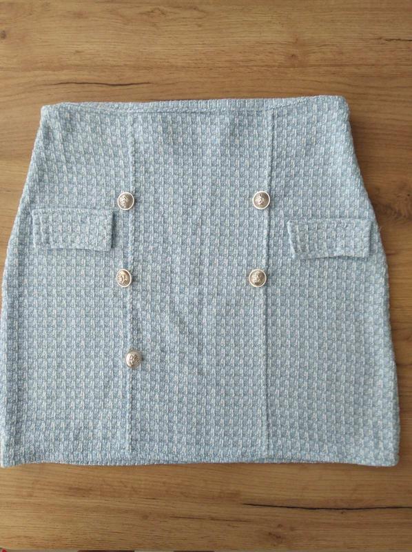 Юбка нежно голубого цвета 1 и 5 фото приближенное к цвету. Замеры пояс 39 длина 44. не хватает одной пуговицы,