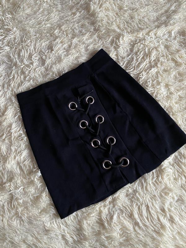 Міні-спідниця в ідеальній якості, в маленький рубчик тягнеться, на бірці розмір L, але підійде на розмір XS-S, більше дивитись по замірах: Довжина 37см Талія 32 см (тягнеться до 40 см) Бедра 40см (тягнеться +5см)