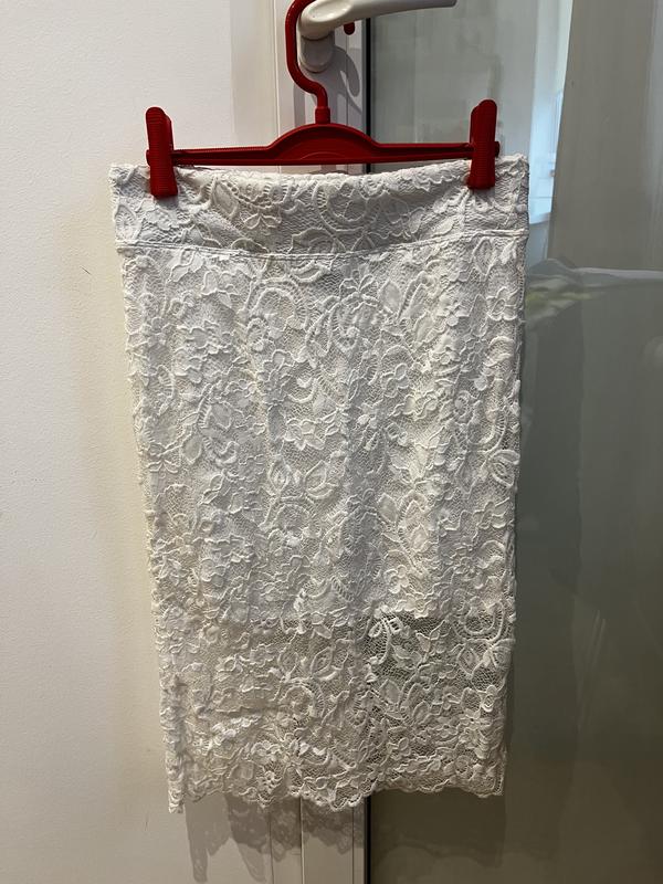 Гипюрова спідниця Divided у білому кольорі. Добре тягнеться, на подкладці, з розрізами. Розмір S. Стан 5/5 Довжина 63см Довжина підкладки 41см Ширина поясу 36см