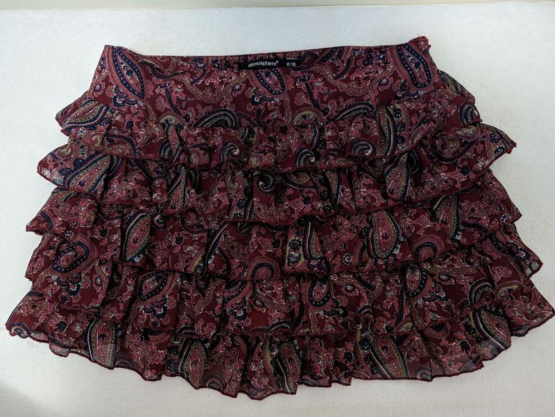 Юбка шифоновая на подкладке, ярусная с узором. На подкладке, не просвечивает, красиво держит форму. Размер xs-s. Застежка сбоку на молнии. Стан - идеальный