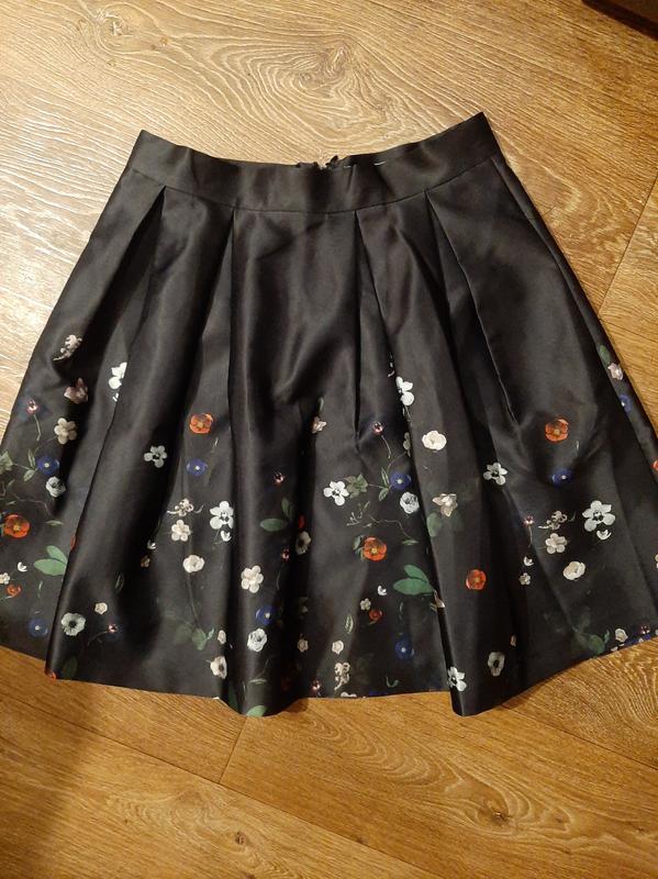 Короткая атласная юбка-клеш с набивным рисунком, со встречной складкой сверху. Карманы в боковом шве. Высокая талия и потайная молния, а также застежка на крючок сзади. Без подкладки