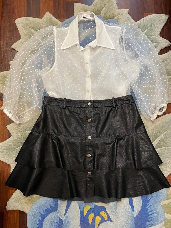 Блузка Zara , ткань органза, новая без бирки, размер м-л, цена 1020юбка Zara, из эко кожи, на заклепках очень красивый фасон, практически новая, размер м/л, цена 1050грн.