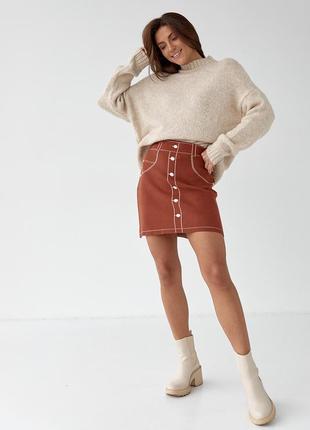 одна молодежная мини-юбка из толстого эластичного трикотажа имеет контрастный рисунок джинсовой юбки. с внутренней стороны пояса вшита тоста резинка. В джинсовом стиле на юбке нарисованы карманы. строчки и пуговицы - оригинальное решение для ярких личностей. Размер с еще есть в сером цвете.