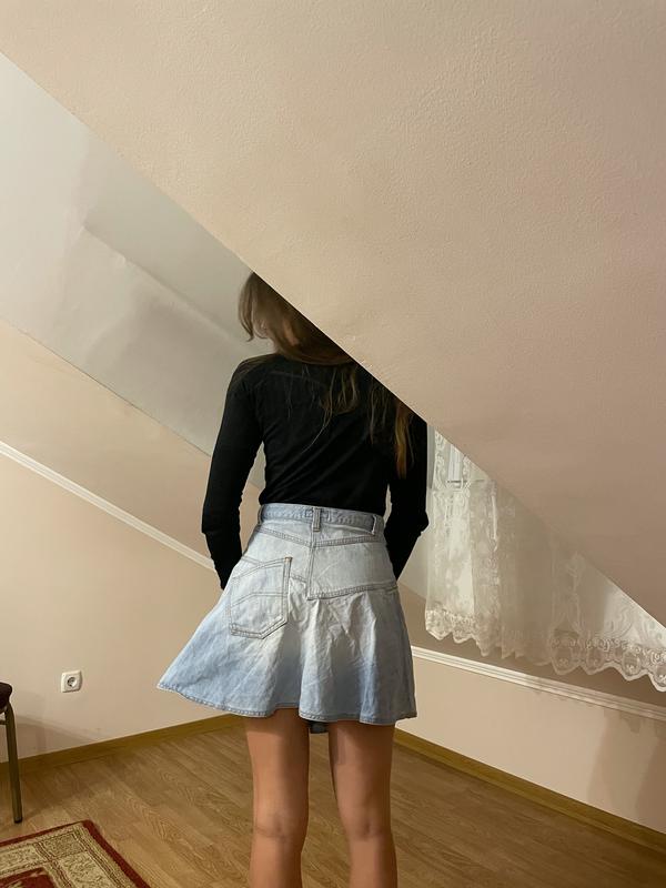 Размер 36-38 Посередине вставленный клеш, два кармана на молнии, застегивается на 4 пуговицы металлических, сзади карман, не симметричная